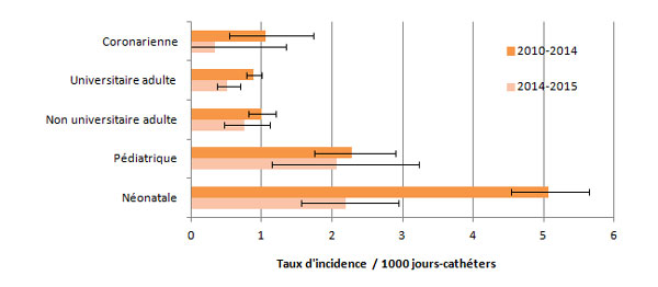 En 2014-2015, le taux était de 0,34 par 1 000 jours-cathéters dans les unités coronariennes, de 0,52 dans les unités universitaires adultes, de 0,76 dans les unités non universitaires adultes, de 2,06 dans les unités pédiatriques et de 2,20 dans les unités néonatales. Le taux moyen le plus bas se trouvait dans les unités coronariennes (tableau 2). Les taux d’incidence des bactériémies étaient plus élevés dans les unités néonatales et pédiatriques, ces taux étant significativement plus élevés que dans les unités adultes (p < 0,01).