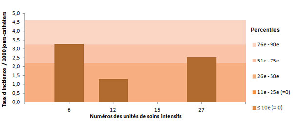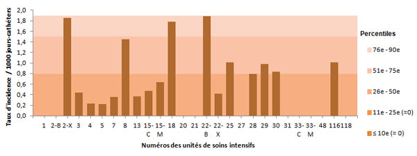 Figure 9 – Taux d’incidence des bactériémies par unité (2014-2015) et percentiles des taux d’incidence (2010-2011 à 2013-2014), pour les unités de soins intensifs non universitaires adultes, Québec, 2014-2015 (taux par 1 000 jours-cathéters)
