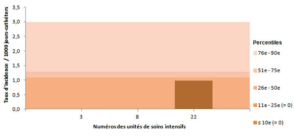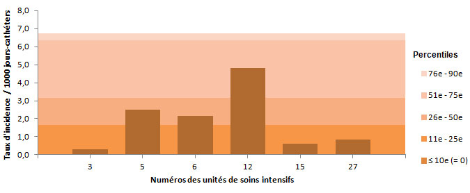 Figure 7 – Taux d’incidence des bactériémies par unité (2014-2015) et percentiles des taux d’incidence (2010-2011 à 2013-2014), pour les unités de soins intensifs coronariennes, Québec, 2014-2015 (taux par 1 000 jours-cathéters)