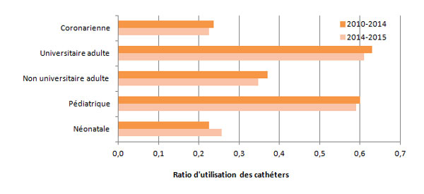 Outre la diminution marquée du nombre de cas rapportés, une augmentation significative du ratio d’utilisation de cathéters (p < 0,05) dans les unités néonatales a été observée. Le ratio d’utilisation a diminué significativement dans les autres unités (figure 2).