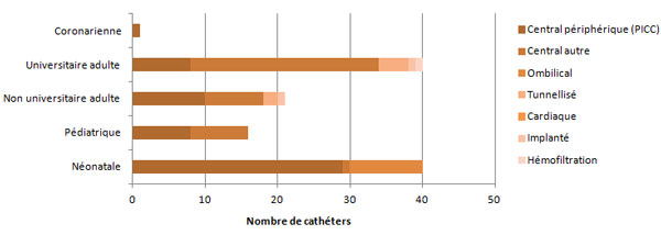 Note : Plus d’un cathéter peut être rapporté pour une bactériémie donnée, d’où le nombre de cathéters plus élevé que le nombre de bactériémies présenté précédemment.