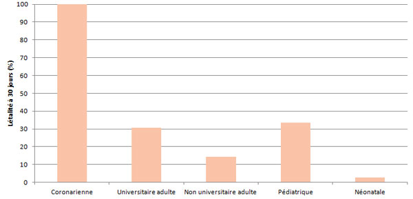 En 2014-2015, 19 % des cas de bactériémie se sont conclus par un décès dans les 30 jours suivants le début de la maladie (tableau 4). La létalité était de 100 % dans les unités coronariennes (figure 4), mais le nombre de cas était très petit. La létalité globale de 19 % n’est pas une diminution significative par rapport à la létalité de 16 % observée en 2013-2014 (p > 0,05).