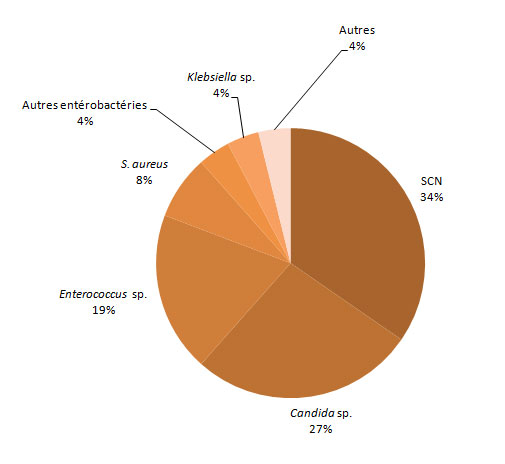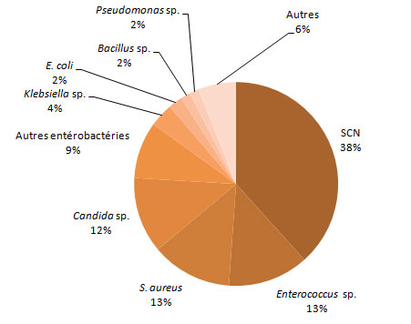 La figure 5 indique que les microorganismes les plus fréquemment isolés dans l’ensemble des bactériémies étaient d’abord les staphylocoques à coagulase négative (SCN, 38 %), suivis des Enterococcus sp. (13 %) et des S. aureus (13 %). Chez les cas décédés, les SCN et les Candida sp. représentaient près des deux tiers des microorganismes isolés (61 %).