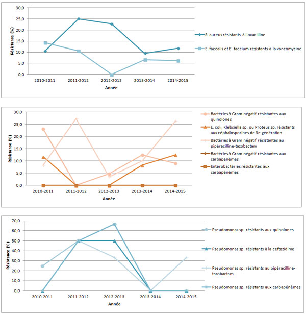 En 2014-2015, 12 % des S. aureus étaient résistants à l’oxacilline et 26 % des 19 bactéries à Gram négatif démontraient une résistance au pipéracilline-tazobactam. Une bactériémie à entérocoque résistant à la vancomycine (un Enterococcus faecium) a été rapportée (tableau 5 et figure 6), pour une proportion de résistance de 6 %.