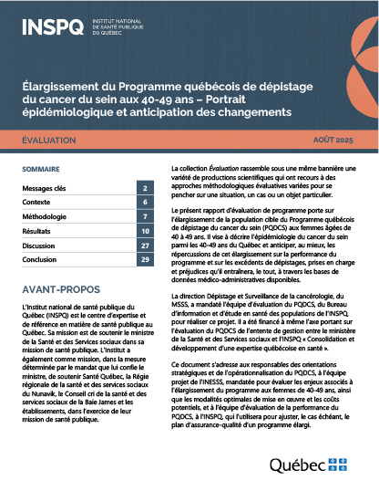 Ce rapport d’évaluation de programme porte sur l’élargissement de la population cible du Programme québécois de dépistage du cancer du sein (PQDCS) aux femmes âgées de 40 à 49 ans. Il vise à décrire l’épidémiologie du cancer du sein parmi les 40-49 ans du Québec et anticiper, au mieux, les répercussions de cet élargissement sur la performance du programme et sur les excédents de dépistages, prises en charge et préjudices qu’il entraînera, le tout, à travers les bases de données médico-administratives disponibles.