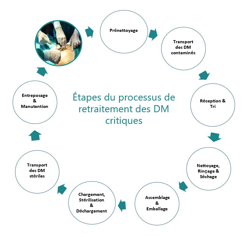 Le schéma simplifié ci-dessous présente les étapes de retraitement des dispositifs médicaux critiques.