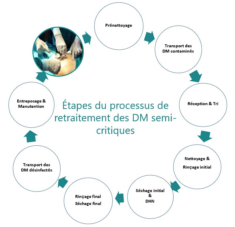 Le schéma simplifié ci-dessous présente les étapes de retraitement des dispositifs médicaux semi-critiques.